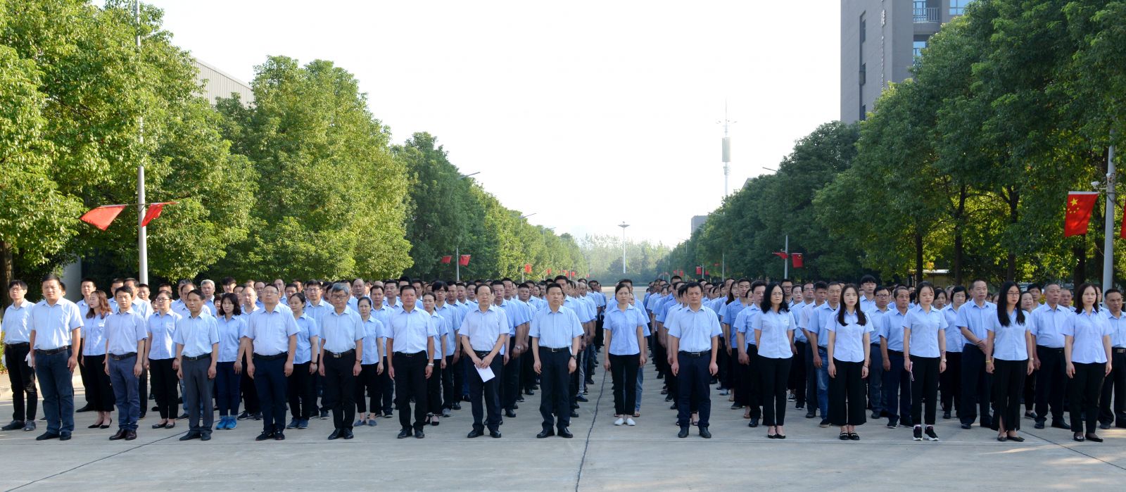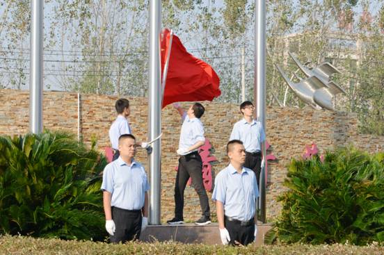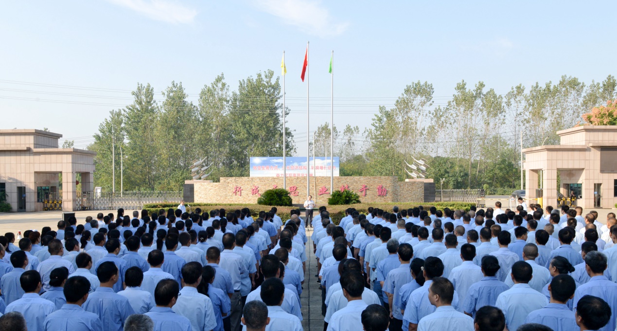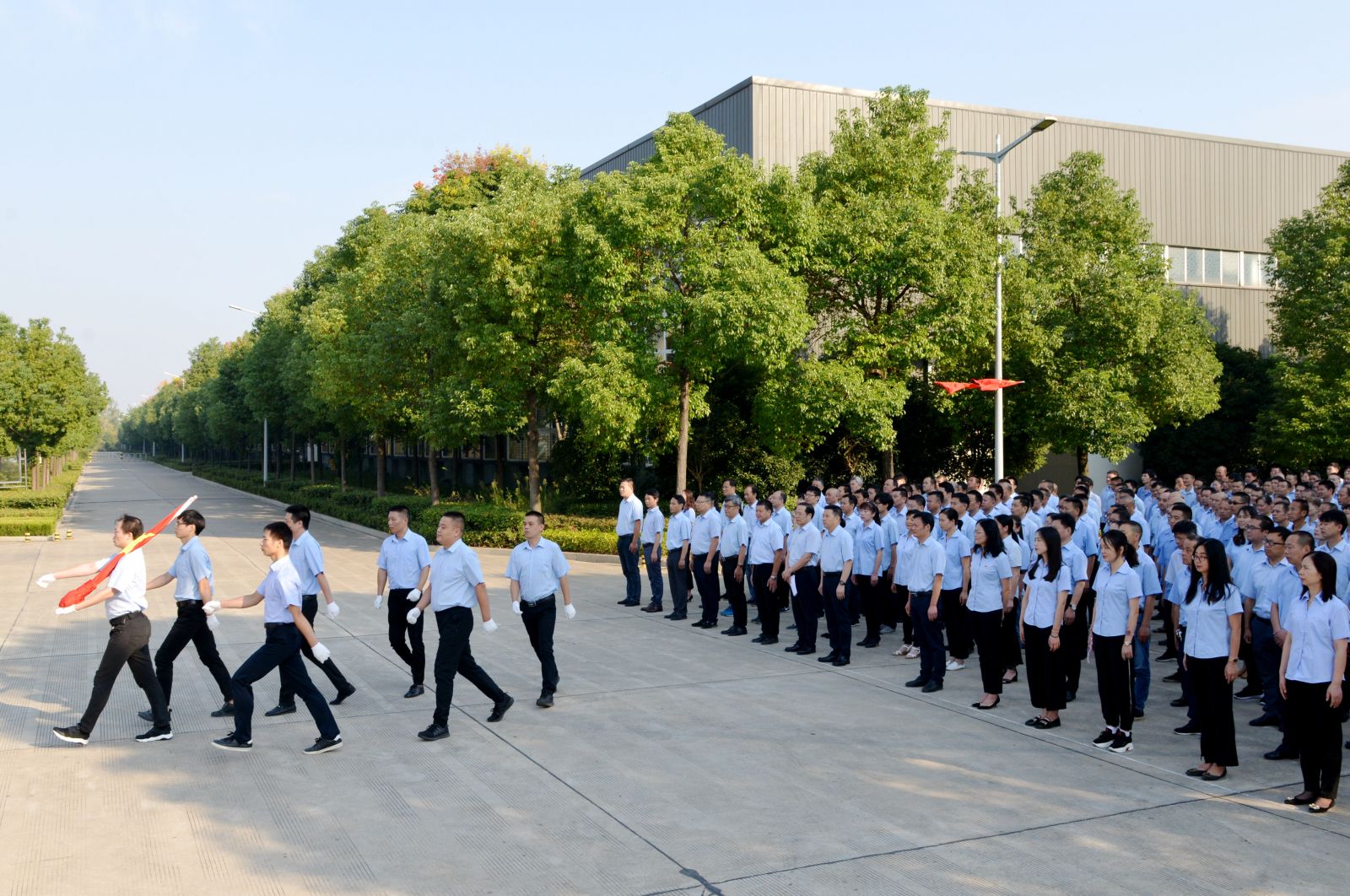 8:20時,活動儀式在總經理焦倫進的主持下啟動,七名旗手邁正步從員工方隊繞過,直達旗壇,行進口令威武響亮。在主持人的指令下,三名旗手將一面鮮艷的五星紅旗在莊嚴的國歌聲中徐緩地升上天空,員工方隊注目國旗,唱起雄壯的國歌。