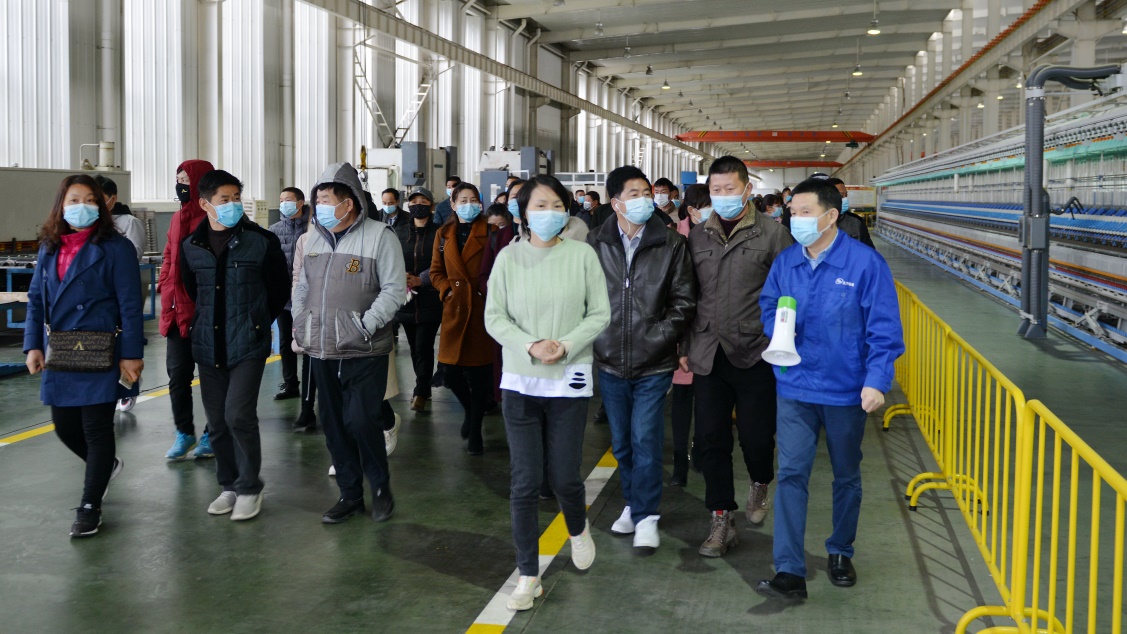 沈方勇董事長帶領求職人員參觀生產現場。疫情期間,天門紡機兌現不給黨和政府添麻煩、不給疫情防控造壓力、不給社會就業增負擔的承諾,想方設法招賢納士擴大就業。