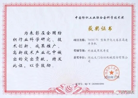 董事長代表公司獲評“2019中國紡織行業年度創新人物”。TM3817S型并條機獲評“紡織之光”2020年度中國紡織工業聯合會“科技成果優秀獎”。鄭強、楊家軒、黃必廣、郭升旗、徐紅、譚鵬飛、沈忱等7名研發人員獲得個人“科技成果優秀獎”。