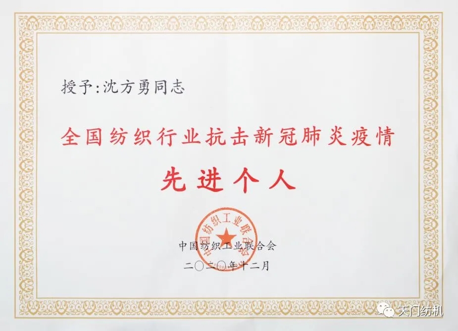 國家衛建委、湖北省、天門市共11次檢查指導防疫工作,給予高度好評。國家衛健委副主任于學軍評價天門紡機防疫有預案、有演練、有實踐,對企業抓防疫、保復產、促就業給予了充分肯定。9月,董事長獲評“全國紡織行業抗擊新冠肺炎疫情先進個人”、天門市“抗擊新冠肺炎疫情先進個人”,代表公司在疫情的大考中獲得時代新榮譽。