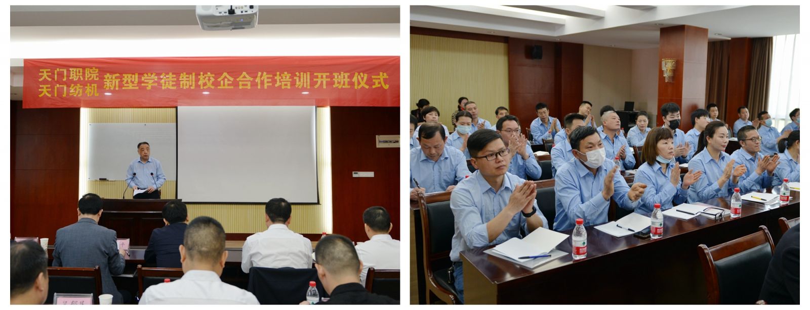 天門紡機黨委書記魯德文介紹了《天門職院與天門紡機新型學徒制培訓方案》,天門職業學院教師何漢兵作了發言,他代表全體培訓教師表態,一定不負期望,精心備課,靈活施教,圓滿完成教學任務。