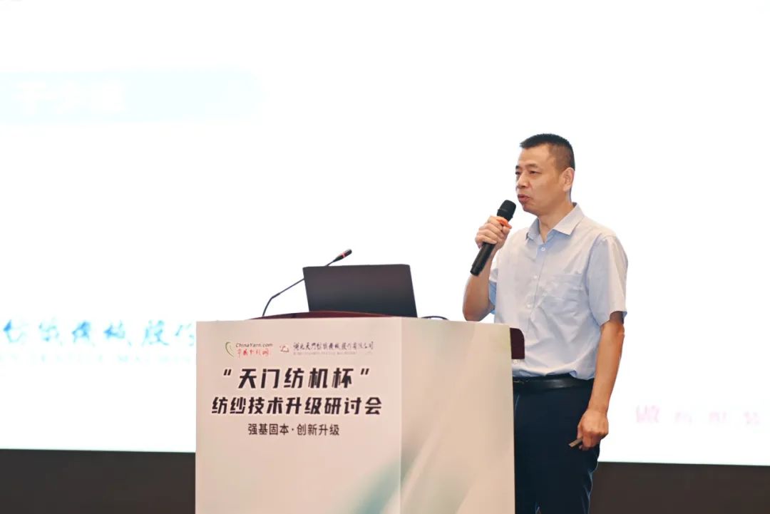 天門紡機總經理焦倫進向蒞臨會議的領導、嘉賓及長期關心支持天門紡機發展的各界同仁朋友表達了誠摯的謝意,他表示,天門紡機“生產制造柔性化、倉儲物流自動化、信息管理現代化”的5G+智慧工廠項目正在不斷向前推進,我們將通過自身的數字化轉型與智能化改造,為紡織企業數字化轉型和智能化改造持續提供裝備基礎。并作了題為《并條機的創新與應用助力紡企高質量發展》的專題報告。他交流了天門紡機堅定不移走“專精特新”之路的工作經驗,分享了勻整控制、在線監控、5G+物聯網、自動熱交換降溫系統等技術創新成果。