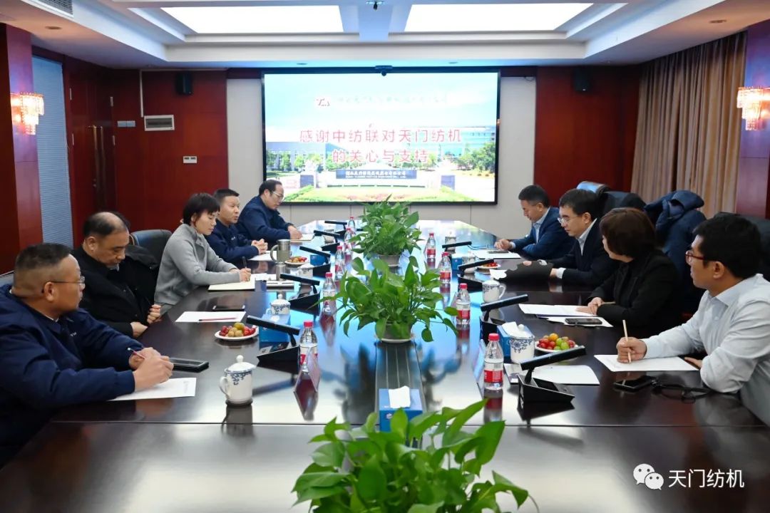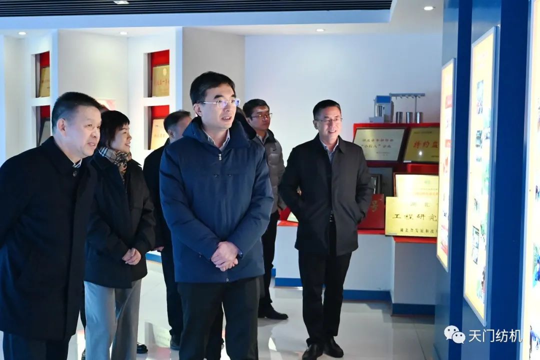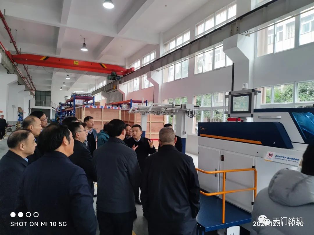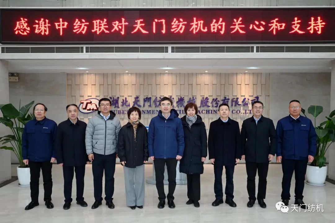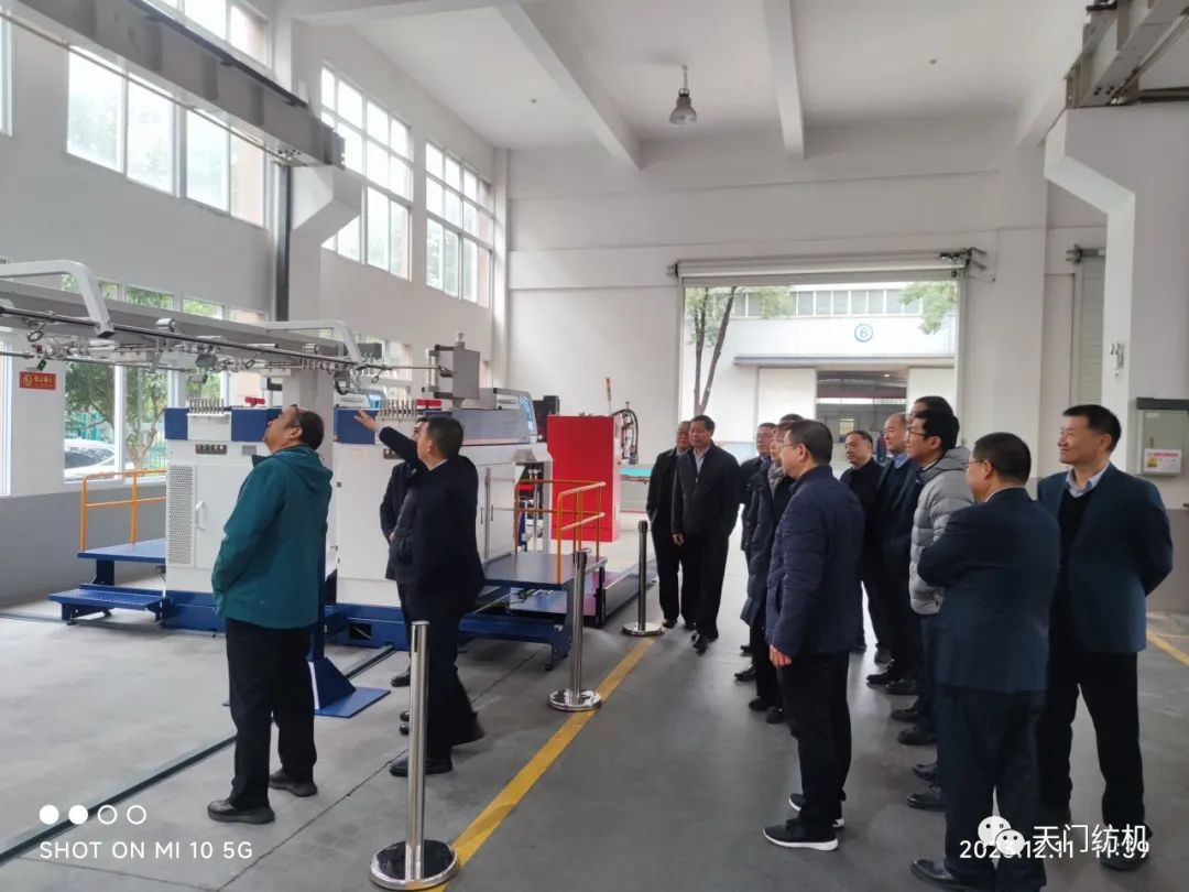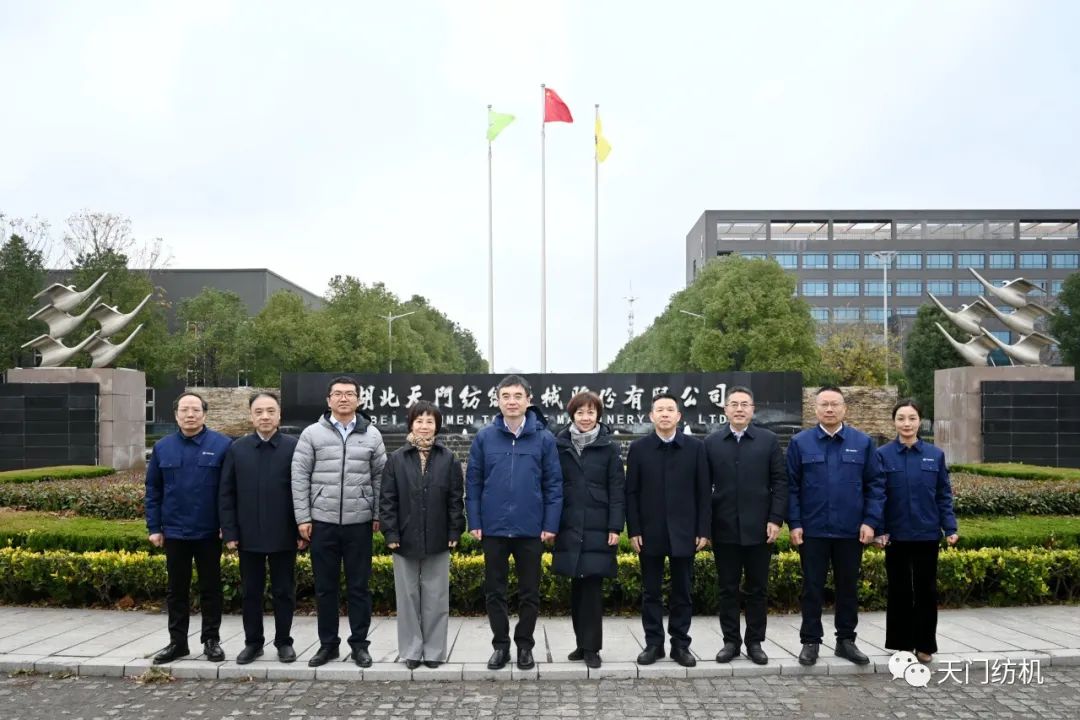2023年12月11日,中國紡織工業聯合會副會長端小平,中國紡織工業聯合會信息中心黨委書記、社會責任辦主任閻巖,中國棉紡織行業協會會長董奎勇、副會長景慎全等領導專程調研天門紡機位于武漢的研發中心及天門基地。