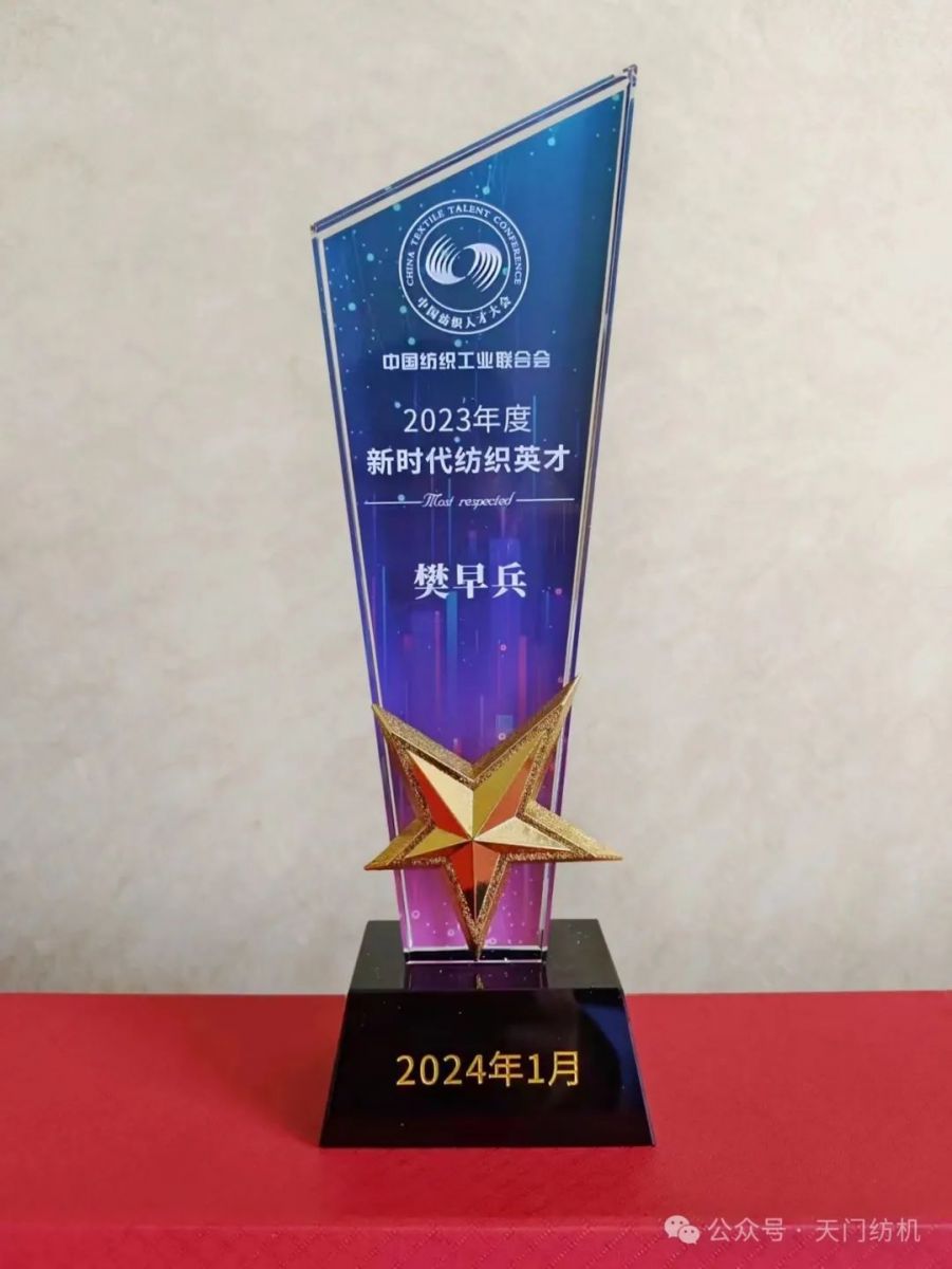 2024年1月16日,樊早兵同志在全國人大會議中心參加“2023年中國紡織人才大會”,受到中紡聯表彰,獲得“2023年度新時代紡織英才”獎牌和榮譽證書。