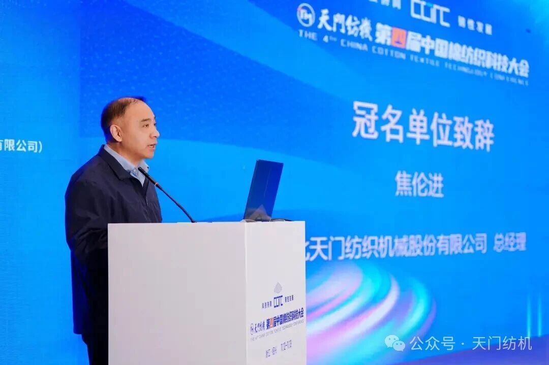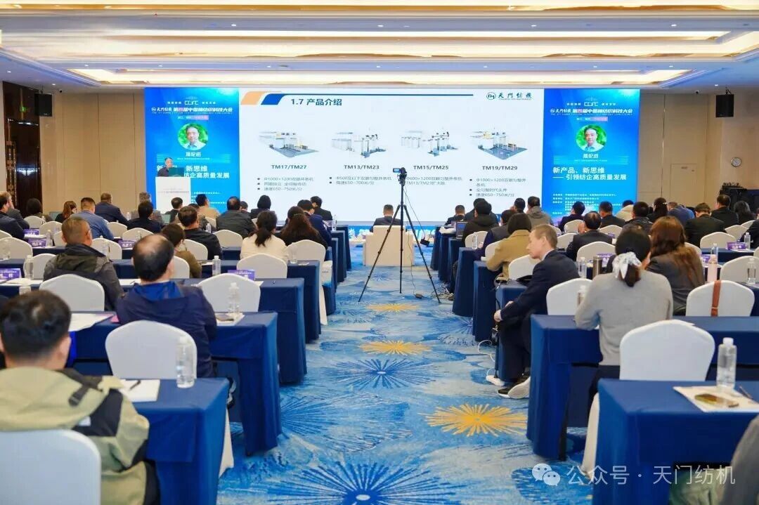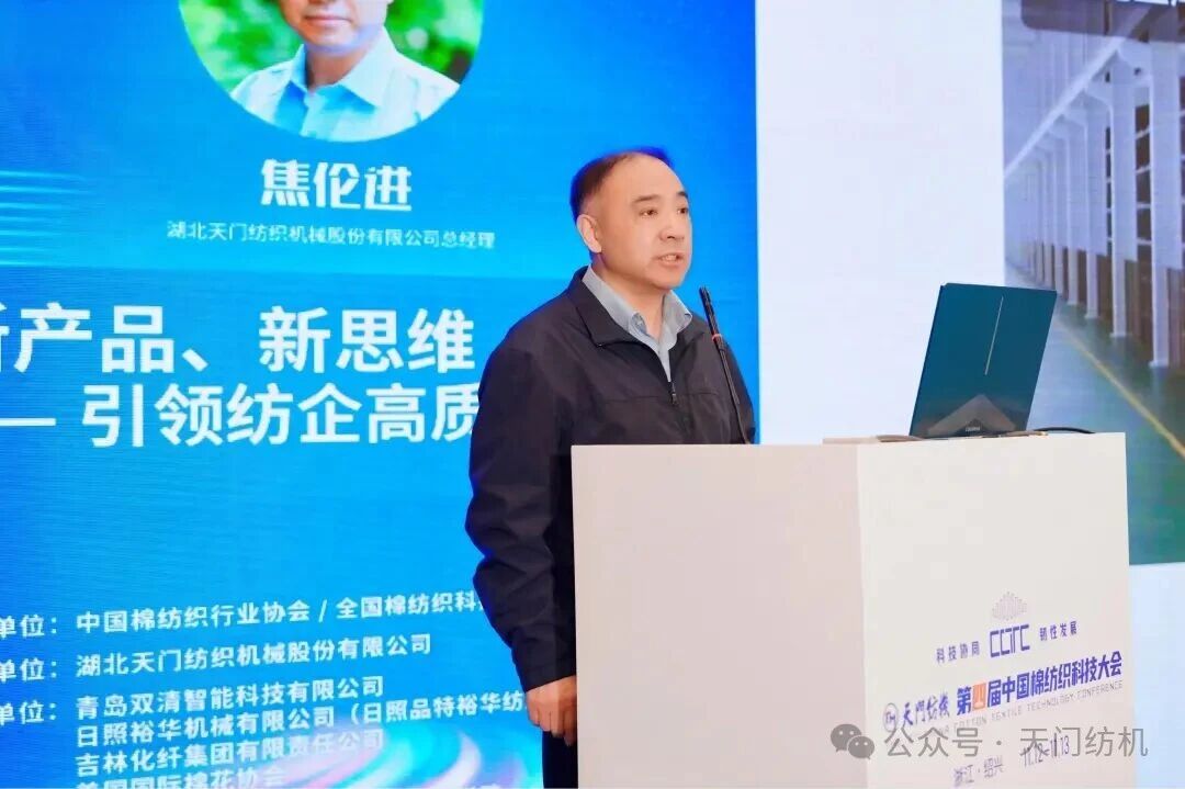 天門紡機總經(jīng)理焦倫進代表冠名單位致辭。他表示,40余年來,天門紡機秉持“并條做精、企業(yè)做強”初心,深耕并條機領域,以優(yōu)質產(chǎn)品、服務及品牌引領行業(yè)發(fā)展。其雙眼自調(diào)勻整并條機已在棉紡企業(yè)廣泛推廣應用,顯著提升了紗線質量與生產(chǎn)效率,成為紡紗企業(yè)必備裝備;“并條工序全自調(diào)勻整”理念亦獲得客戶認可,有效改善紗線和布面質量。在技術創(chuàng)新方面,天門紡機成果豐碩,TM1系列并條機已成紡織行業(yè)主力產(chǎn)品,T2系列產(chǎn)品正逐步推向市場,搭載智能在線檢測、一控多軸多臺及數(shù)據(jù)管理云平臺技術的“產(chǎn)線聯(lián)動”并條機引起了業(yè)界廣泛關注。同時,天門紡機全力推進“智改數(shù)轉”,“智慧工廠”項目正在如火如荼地建設之中。他指出,天門紡機始終關注行業(yè)的最新動態(tài)和前沿技術,希望與業(yè)界加強溝通與合作,攜手發(fā)展。